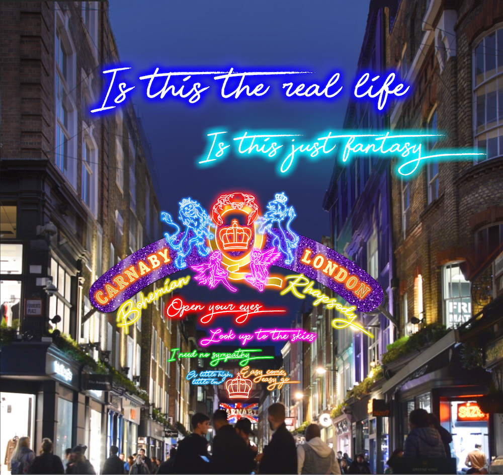 World-famous Carnaby Street will unveil an exclusive art installation in celebration of the Twentieth Century Fox and Regency Enterprises film Bohemian Rhapsody. Hailed as one of the greatest rock songs of all time and topping charts as a best-selling single for over forty years, Freddie Mercury’s lyrics will shine brightly on Carnaby Street ahead of the film’s UK release on 24 October. Shaftesbury, the innovative landlord and owners of the Carnaby estate, have collaborated with Twentieth Century Fox on this unprecedented installation.